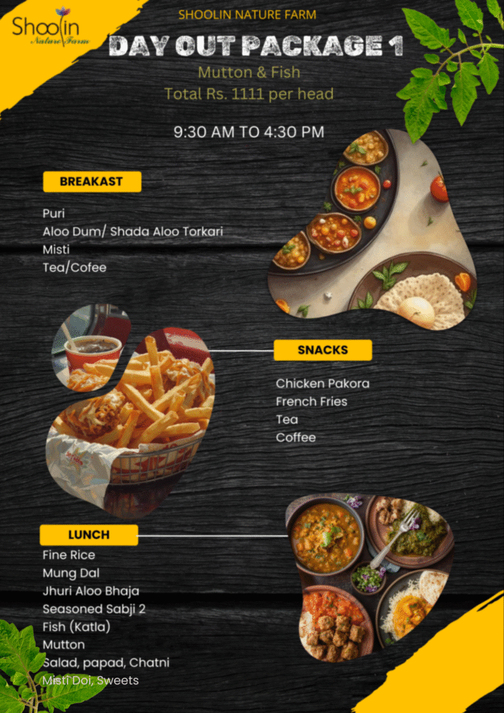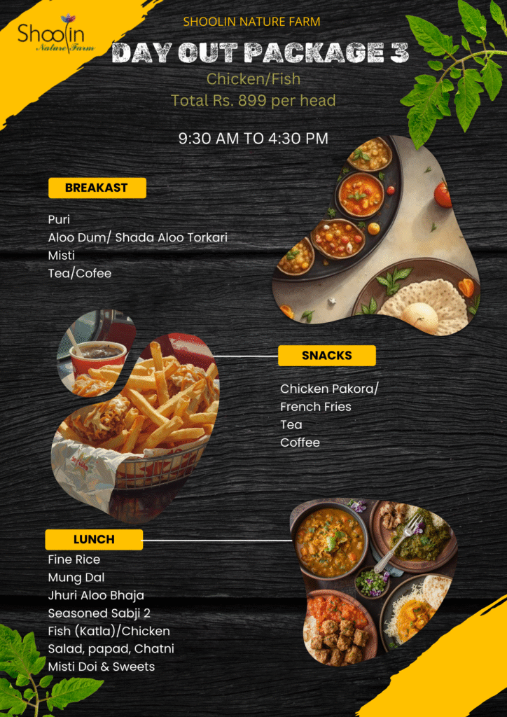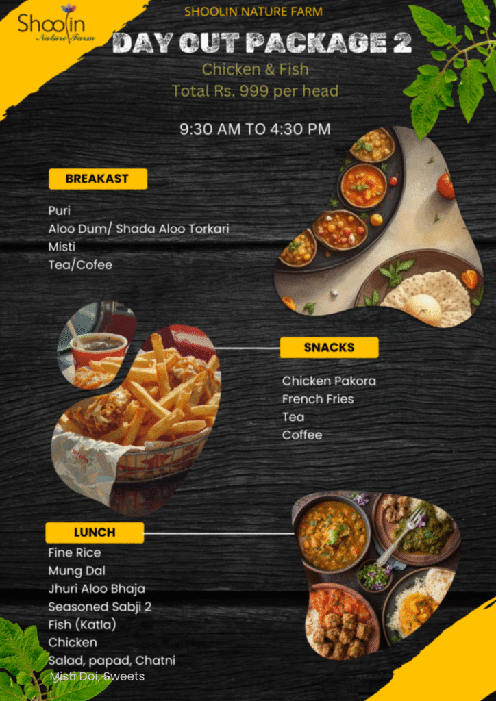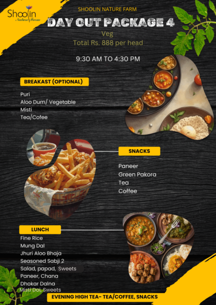 DAY OUTING PACKAGES Select your Package carefully. The package includes entry in the Shoolin Nature Farm, participation in all activities available during the visit and Food/beverages. No additional charges applicable for visiting Shoolin Nature Farm Evening High Tea - Tea/ Coffee & Snacks Book Now